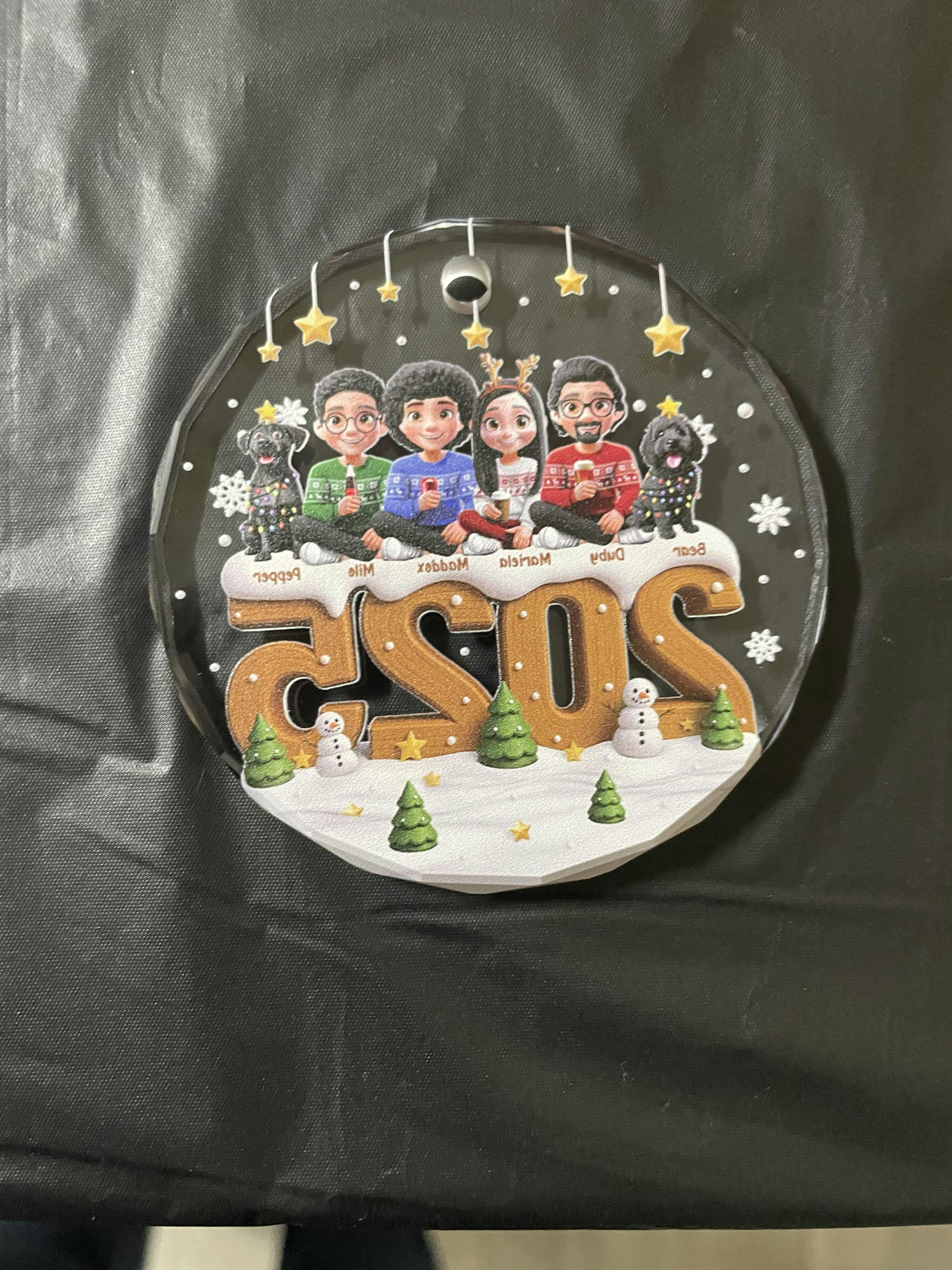 Celebrate love and togetherness with the 3D Effect Christmas Family And Dog Cat - Personalized Circle Glass Ornament! Meticulously crafted from 100% clear glass with beveled edges, this solid glass exudes timeless elegance, catching and reflecting light beautifully to add a radiant touch to your Christmas tree, wreath, or mantel. The ornament’s beveled edges create a stunning prism effect, giving it a sophisticated, multi-dimensional appearance. The smooth, crystal-clear surface is perfect for customizing.