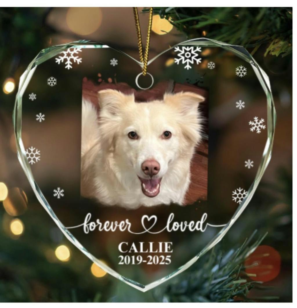 Crafted from elegant heart-shaped glass, this ornament can be personalized with a cherished photo and name. Hang it on the Christmas tree, display it near a pet’s resting place, or keep it close year-round - this ornament provides peace and comfort through remembrance.