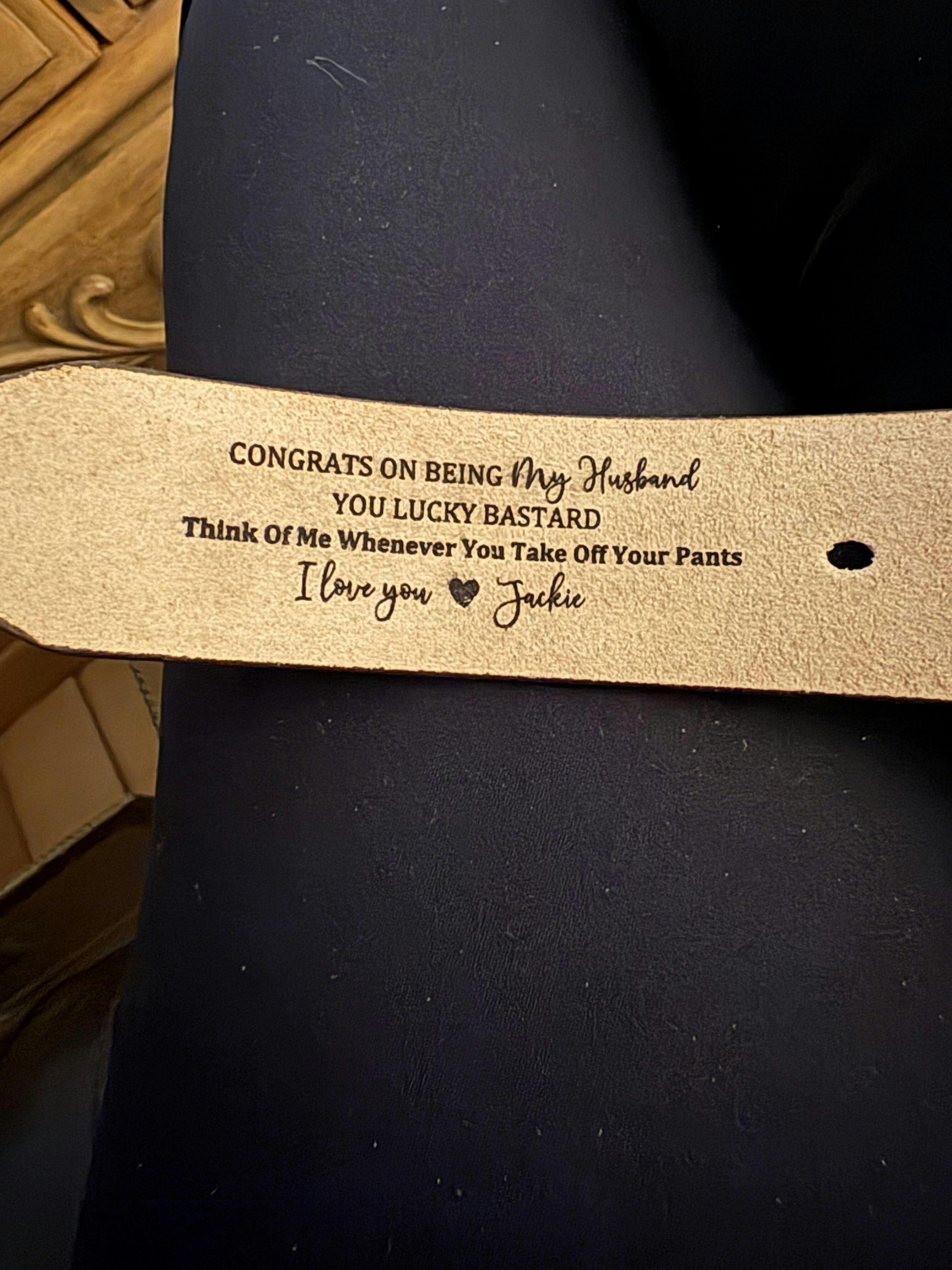The I Licked It So It's Mine - Personalized Engraved Leather Belt is the perfect mix of humor and practicality, making it an unforgettable gift for couples, husbands, or boyfriends. This unique and cool accessory features a hilarious engraved message that’s sure to spark laughter every time it’s worn. Whether it’s for a birthday, anniversary, Valentine’s Day, Thanksgiving, or just because, this belt adds a playful twist to any outfit while showcasing your thoughtful sense of humor.