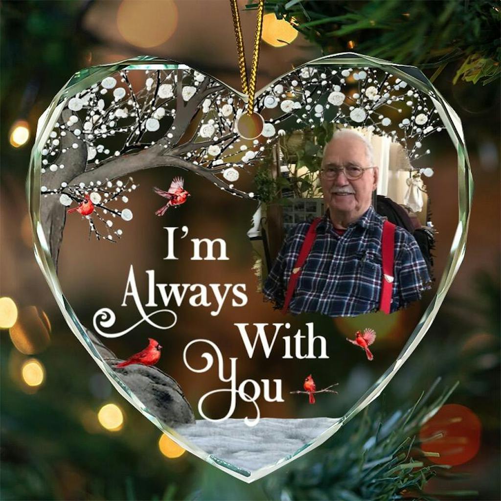 Cherish the memories of loved ones with the "Custom Photo I'm Always With You Memorial - Personalized Heart-Shaped Glass Ornament." This beautiful heart-shaped ornament is perfect for honoring the memory of Grandpa, Grandma, Mom, Dad, or any special family member. Ideal for Christmas, Thanksgiving, Mother's Day, Father's Day, birthdays, and anniversaries, it makes a meaningful and thoughtful gift.
