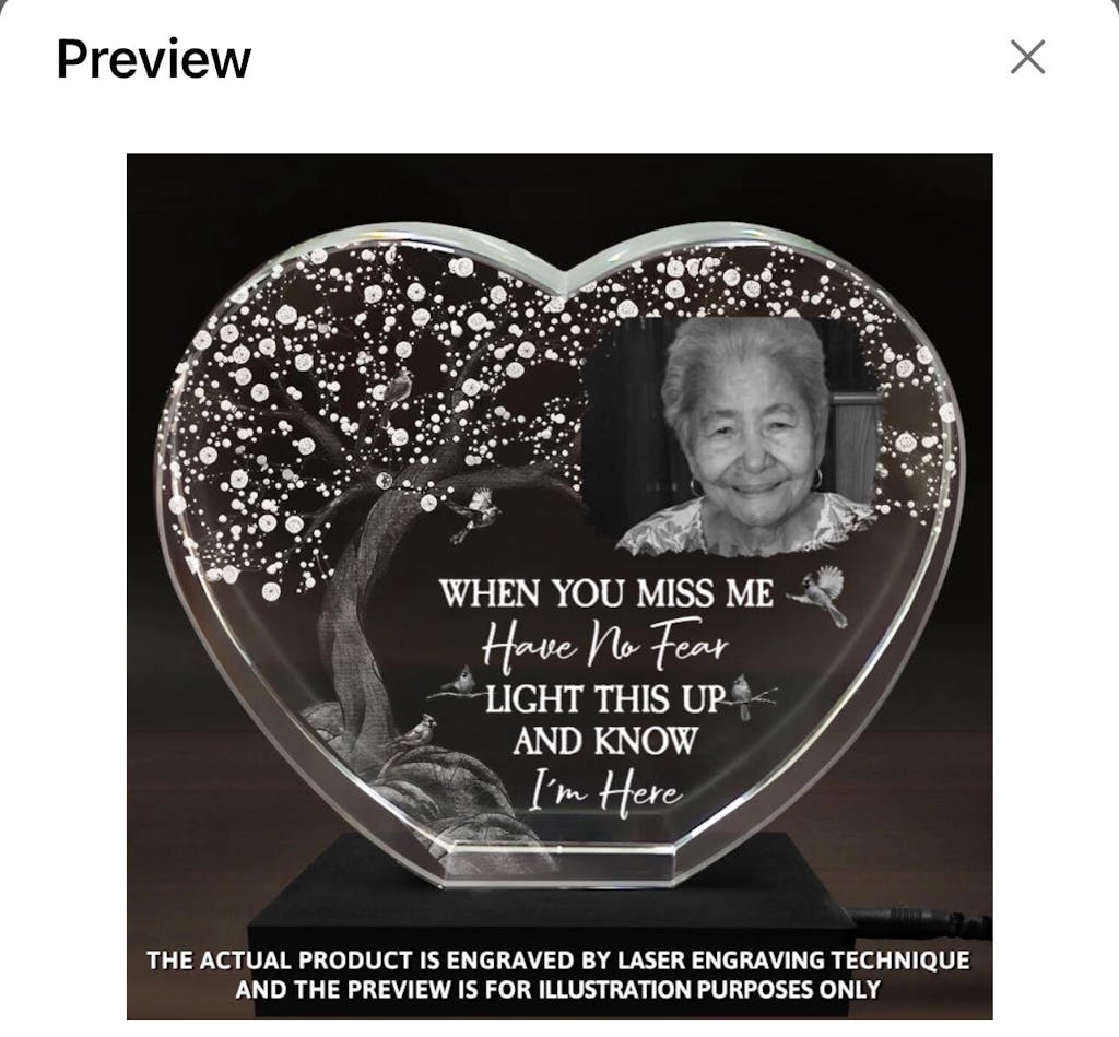 Celebrate everlasting connection with the Custom Photo When You Miss Me Have No Fear - Personalized Crystal Heart. Designed as a gift for Memorial, Bereavement, or Sympathy occasions, it offers comfort and serenity to anyone missing someone special. Perfect for Christmas, Anniversaries, or Reflection Days, this crystal heart preserves love in a truly beautiful way.