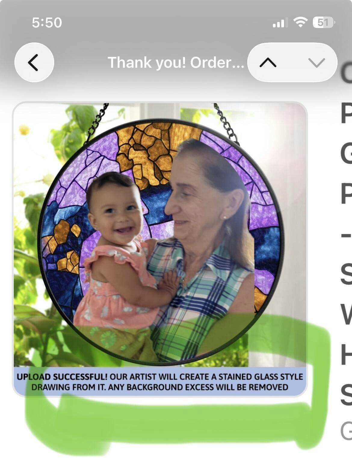 I did not receive the advertised stained drawing of the photograph I submitted. Instead my mother in law received a very late Christmas gift (it took about 6 weeks to arrive) of a photo on stained glass. After writing to Wander prints and disputing the error, they insisted it was correct despite proof of their error. I will not buy from them again.