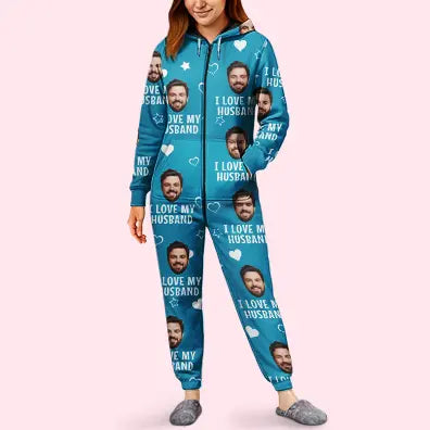 Gift For Husband,Gift For Wife,Gift For Couples,Custom Photo,Funny - Custom Photo Funny I Love My Wife Husband - Personalized Overall Onesie Hooded Jumpsuit