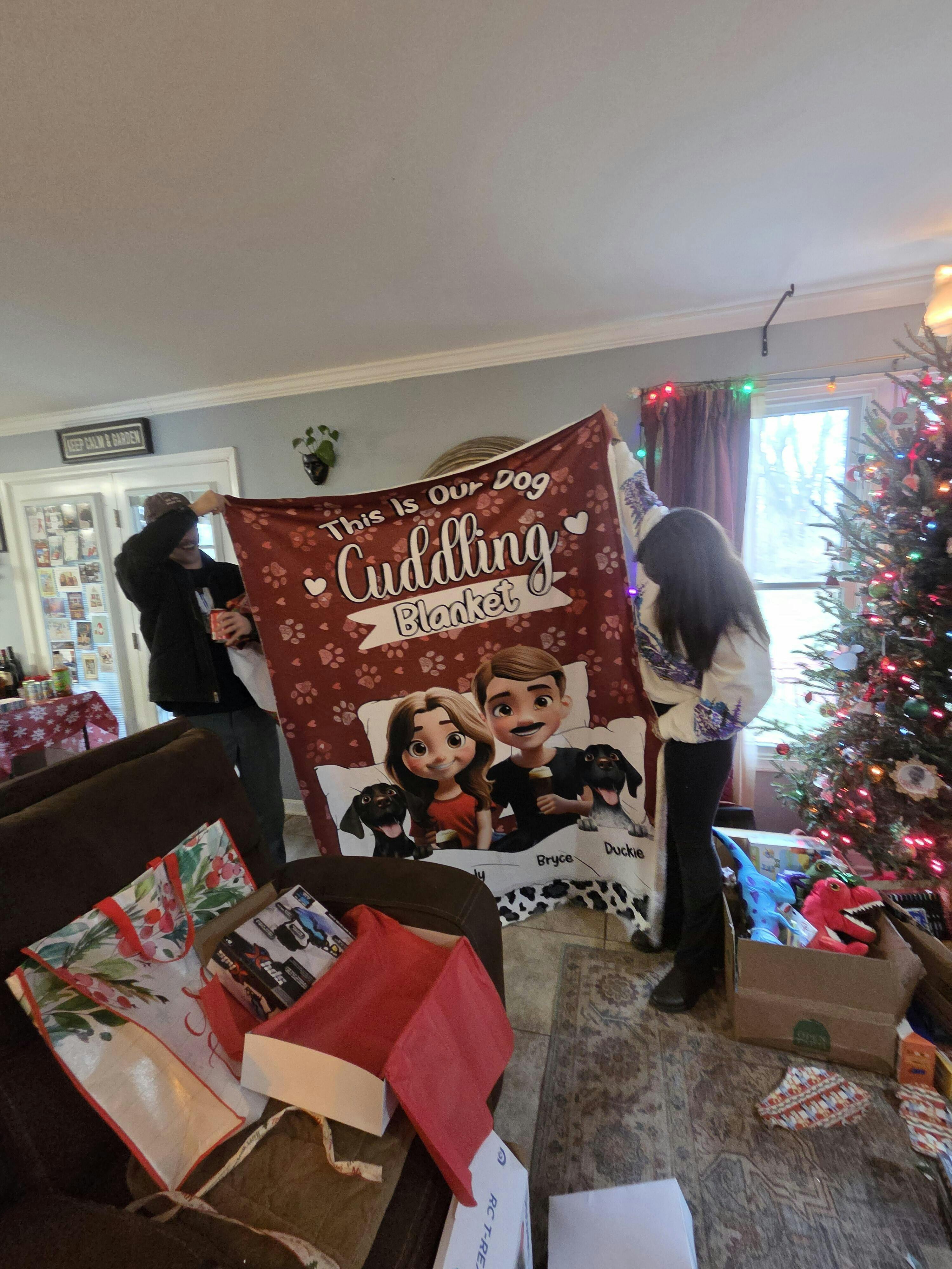 Message: "This is our dog cuddling blanket".