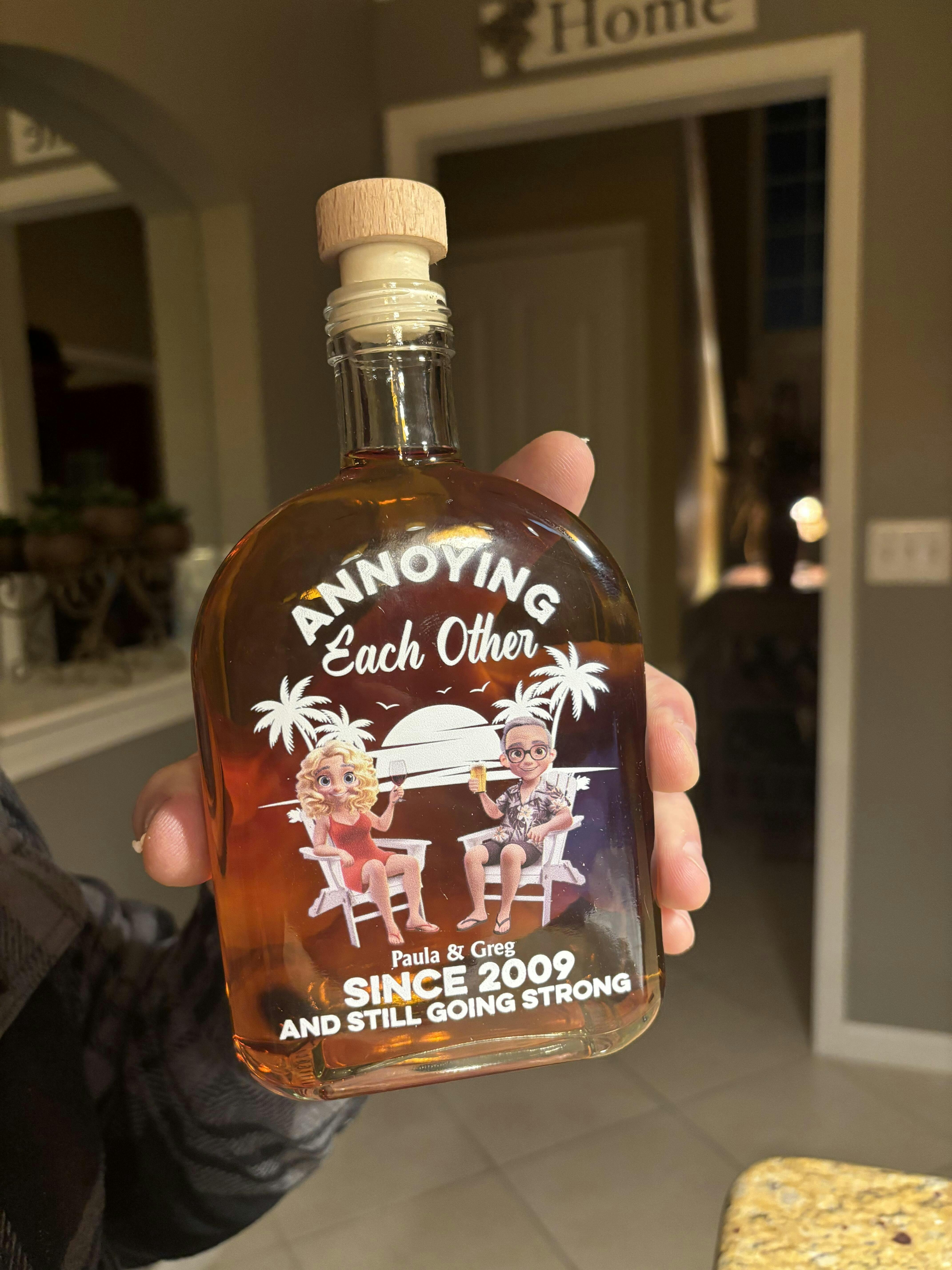 Célébrez votre histoire d'amour-haine préférée avec la bouteille de whisky personnalisée « Annoying Each Other Since », un cadeau idéal pour les couples, les maris, les femmes, les copains ou les copines, pour un anniversaire, la Saint-Valentin, Noël ou tout simplement pour le plaisir. Ce souvenir original et drôle ajoute une touche d'humour et de cœur à toutes les célébrations.