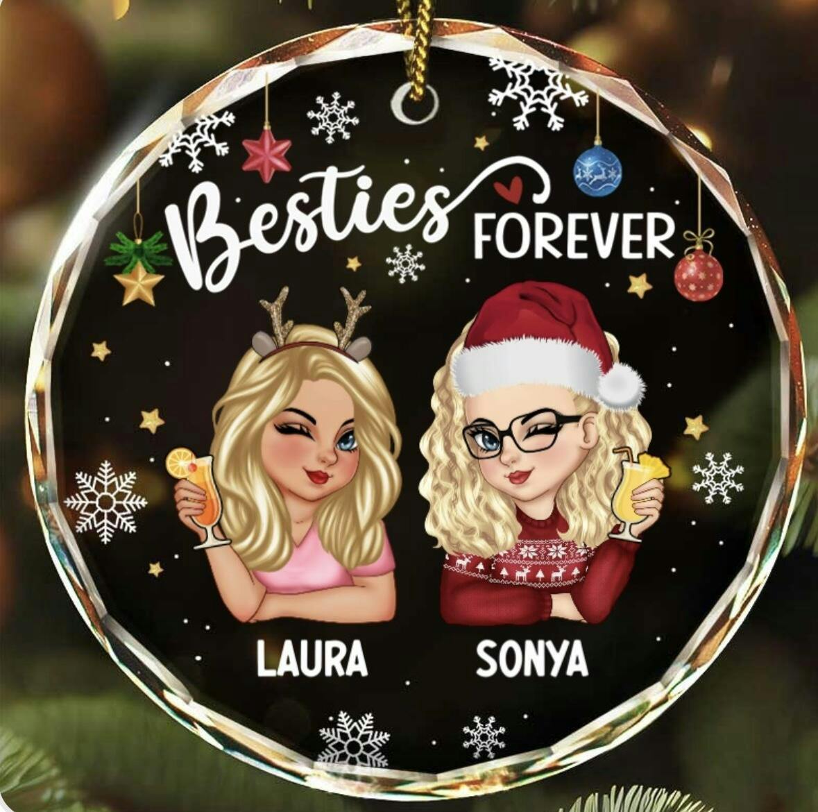 Celebrate the special bond with your bestie this holiday season with the "Besties Forever Christmas - Personalized Circle Glass Ornament." This charming ornament is an ideal gift for best friends, sisters, siblings, colleagues, or soulmates. Perfect for Christmas, Thanksgiving, birthdays, and anniversaries, it offers a unique way to commemorate your cherished relationships.