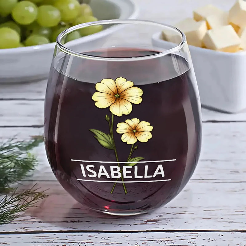 Brighten someone's day with the Birth Flowers Woman - Personalized Stemless Wine Glass, a delightful addition to any celebration. This happy stemless wine glass makes a unique, meaningful, and appreciated gift for women, yourself, besties, sisters, siblings, or colleagues on Thanksgiving, Christmas, birthdays, and anniversaries. Its elegant design and custom floral engraving add a personal and joyful touch.