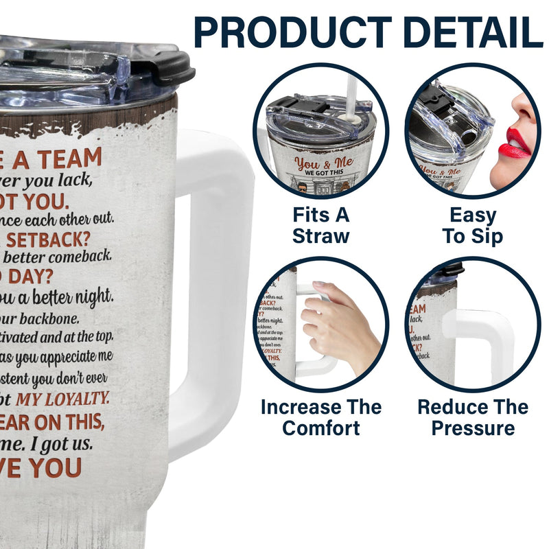We're a team. Whatever you lack, I got you. We will balance each other out. Minor setback? We'll make a better comeback. Bad day? I promise you a better night. I'll be your backbone. I'll keep you motivated and at the top. As long as you appreciate me and remain consistent you don't ever have to doubt my loyalty. I can swear on this, you got me, I got us. I love you